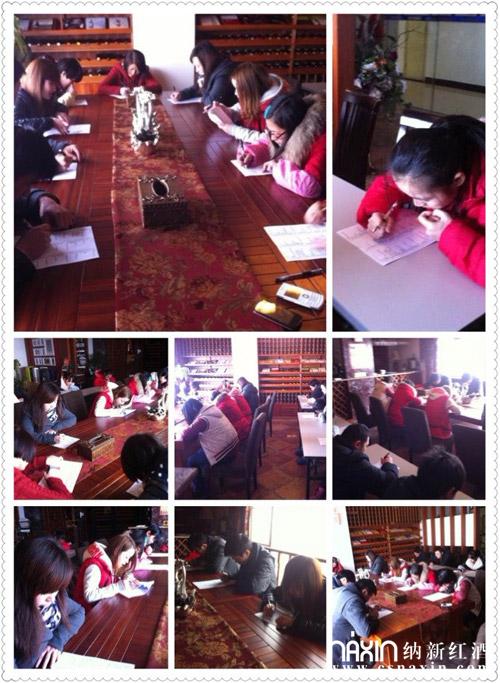 納新紅酒為期五天的專業(yè)知識培訓業(yè)已結(jié)束,正在進行理論考試。盲品加理論綜合考試成績及格者獎勵威樂普陳釀干紅一瓶,其中第一名獎威樂普珍藏干紅一瓶,補考后仍不及格者扣除本月獎金。有壓力,有激勵,才有學習的動力!