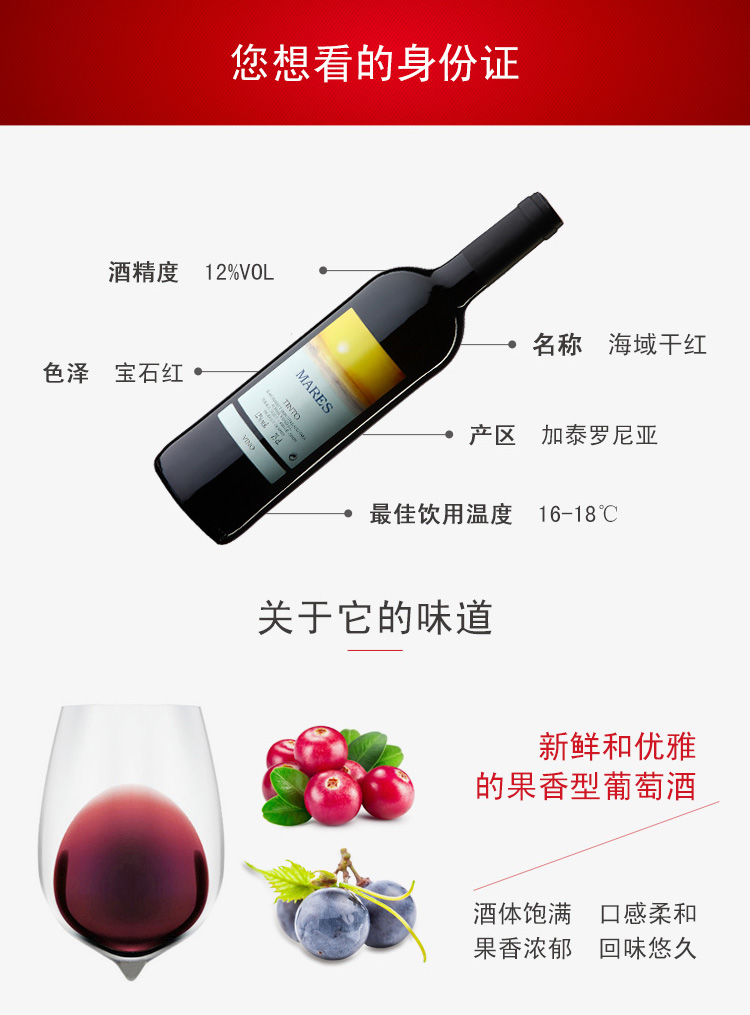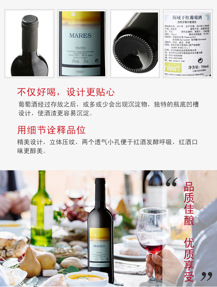西班牙海域干紅葡萄酒 ¥ 98.00 此款選用優(yōu)質(zhì)的坦普拉尼洛、歌海娜和佳利釀混合釀制,酒體飽滿而平衡,是一款新鮮和優(yōu)雅的葡萄酒, 口感柔和細(xì)膩,單寧與濃郁的果香巧妙的結(jié)合, 有充滿優(yōu)雅誘人的果香味,回味持久幽雅。 是搭配紅燒肉、牛排、雞、鴨等肉類菜肴及 朋友聚會(huì)的最佳飲品。 葡萄年份: 2011 罐裝日期: 2012年12月4日 產(chǎn)地: 西班牙 產(chǎn)區(qū): 加泰羅尼亞 最佳飲用溫度: 16℃--18℃ 原料及輔料: 葡萄汁、二氧化硫 酒精度: 12%vol 葡萄品種: 歌海娜、坦普拉尼洛、佳利釀 貯藏條件: 陰涼、避光、臥放 灌裝商: 奧爾曼酒莊 凈含量: 750ml 產(chǎn)品詳情 產(chǎn)品屬性