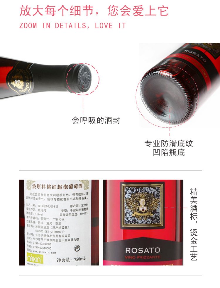 意大利波斯科桃紅起泡葡萄酒 ¥ 158.00 此款選用美樂和拉波索混合釀制, 呈現(xiàn)誘人的櫻桃紅色, 香氣清新迷人,圓潤(rùn)而和諧, 帶有新鮮紅莓和優(yōu)雅的花香, 口感柔和、酒香濃烈、極易入口, 微甜微澀的入口感, 回味不絕, 是一款個(gè)性十足,精致而又特別的佳釀, 適合搭配意大利面、意式調(diào)味飯、烤魚和青菜等清淡菜肴。 產(chǎn)地: 意大利 產(chǎn)區(qū): 威尼托 最佳飲用溫度: 10℃--12℃ 原料及輔料: 葡萄汁、二氧化硫 酒精度: 11%vol 葡萄品種: 美樂(Merlot)、拉波索(Raboso) 貯藏條件: 陰涼、避光、臥放 灌裝商: 波斯科酒莊 產(chǎn)品詳情 產(chǎn)品屬性