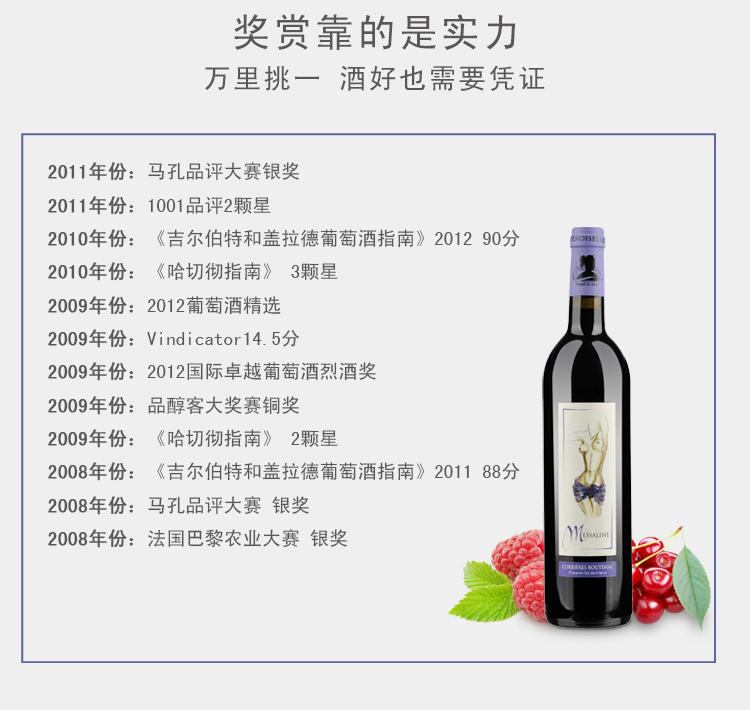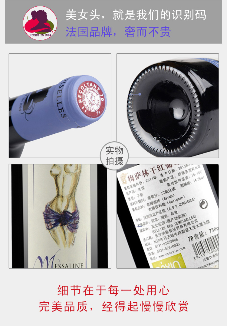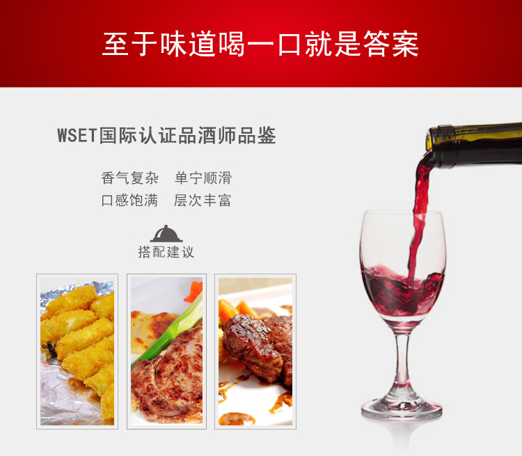 法國(guó)梅薩林AOP干紅葡萄酒 ¥ 1680.00 此款選用老藤西哈和老藤佳利釀混合釀制, 深色酒體,活力富有光澤。香氣豐富復(fù)雜, 散發(fā)出紅色水果和香料的香味,伴有皮革氣息。 單寧如天鵝絨般順滑, 口感飽滿(mǎn)圓潤(rùn), 層次豐富,有橄欖的回味。 橡木桶中陳釀12-18個(gè)月。 2013年產(chǎn)量?jī)H13000瓶,值得珍藏。 配餐:野味,紅肉等。 葡萄年份: 2011年 罐裝日期: 2013年 產(chǎn)地: 法國(guó) 產(chǎn)區(qū): 朗格多克科比埃 最佳飲用溫度: 16℃--18℃ 原料及輔料: 葡萄汁、二氧化硫 酒精度: 14.5%vol 葡萄品種: 老藤西哈(Syrah),老藤佳利釀(Carinena) 等級(jí): 法國(guó)法定產(chǎn)區(qū)級(jí)(A.O.P. CORBIERES) 貯藏條件: 陰涼、避光、臥放 灌裝商: 圣女莊園 凈含量: 750ml 產(chǎn)品詳情 產(chǎn)品屬性