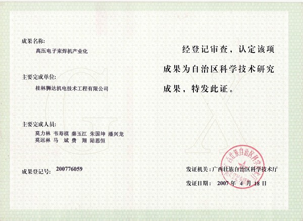 高壓電子束焊機(jī)產(chǎn)業(yè)化成果證書